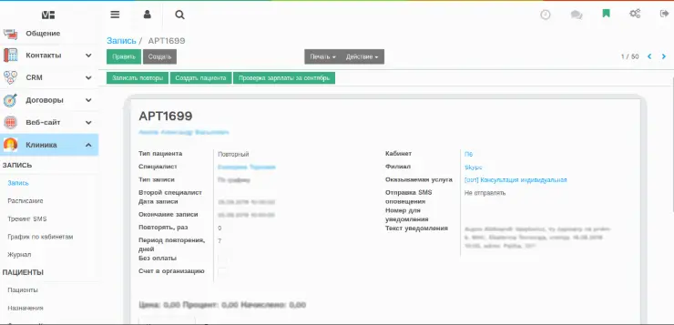 Большая часть финансовой рутины автоматизировано. Автоматически выставляются счета за услуги. Система присылает ссылку на оплату за 2 дня до приема. Автоматически принимается оплата картой, автоматически платеж попадает на баланс клиента.