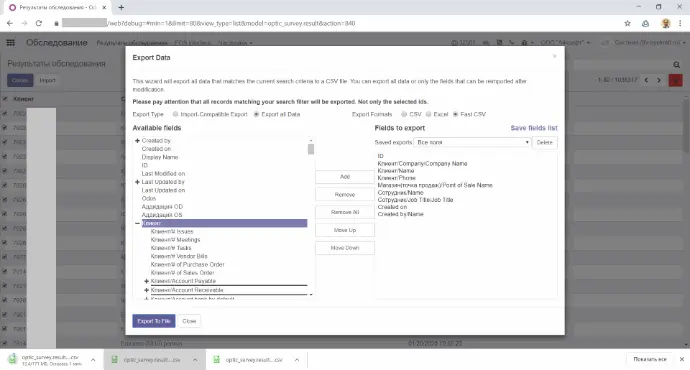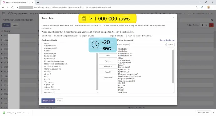 Выполнив самое крупное внедрение Odoo в России, мы столкнулись с необходимостью периодического экспорта огромных объемов данных. Штатные возможности экспорта Odoo активно используют JScript, что сильно сужает возможности размеров экспорта. В большинстве моделей штатный экспорт позволяет выгружать только десятки тысяч строк, а из некоторых моделей проблемой становится выгрузка даже единицы тысяч строк. Также на скорость экспорта заметно влияет быстродействие ПК пользователя.